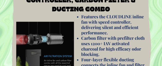 Features the CLOUDLINE inline fan with speed controller, delivering silent and efficient performance. Carbon filter with prefilter cloth uses 1200+ IAV activated charcoal for high efficacy odor blocking. Four-layer flexible ducting connects the inline fan and filter to your grow tent to direct airflow. Kit Duct Size: 8” | Fan Airflow: 724 CFM | Noise